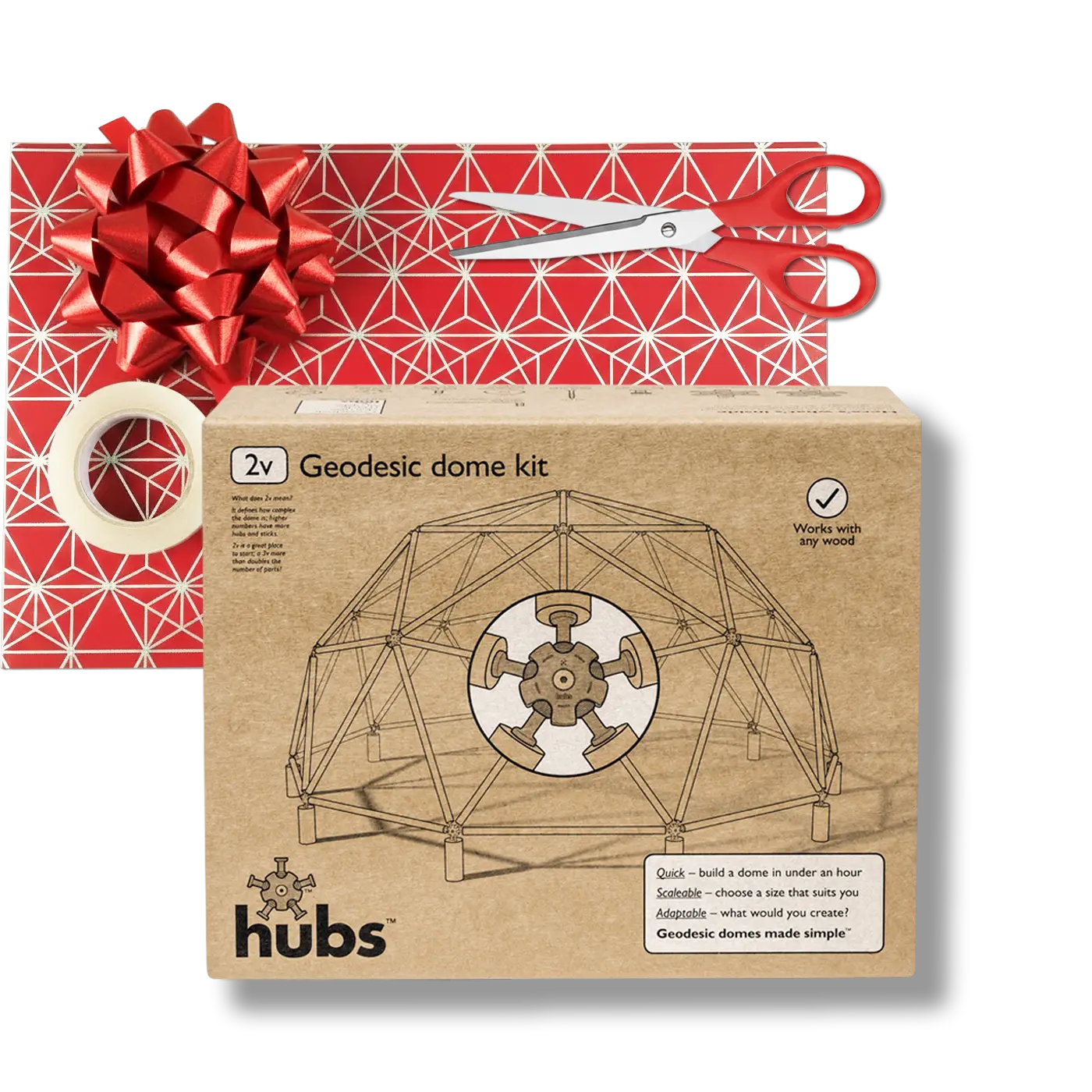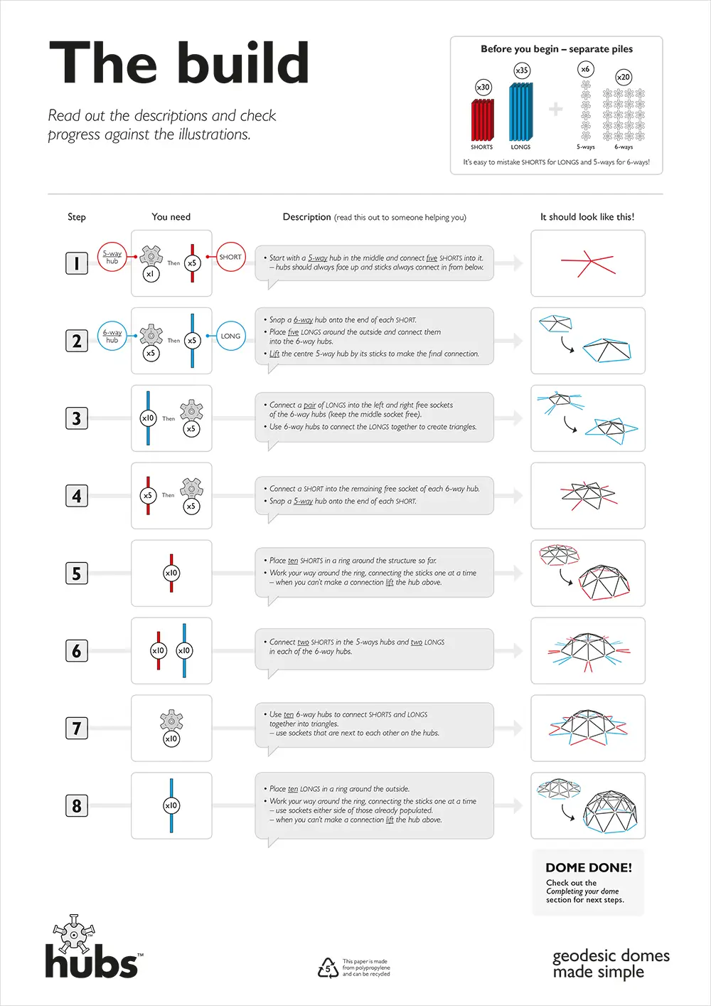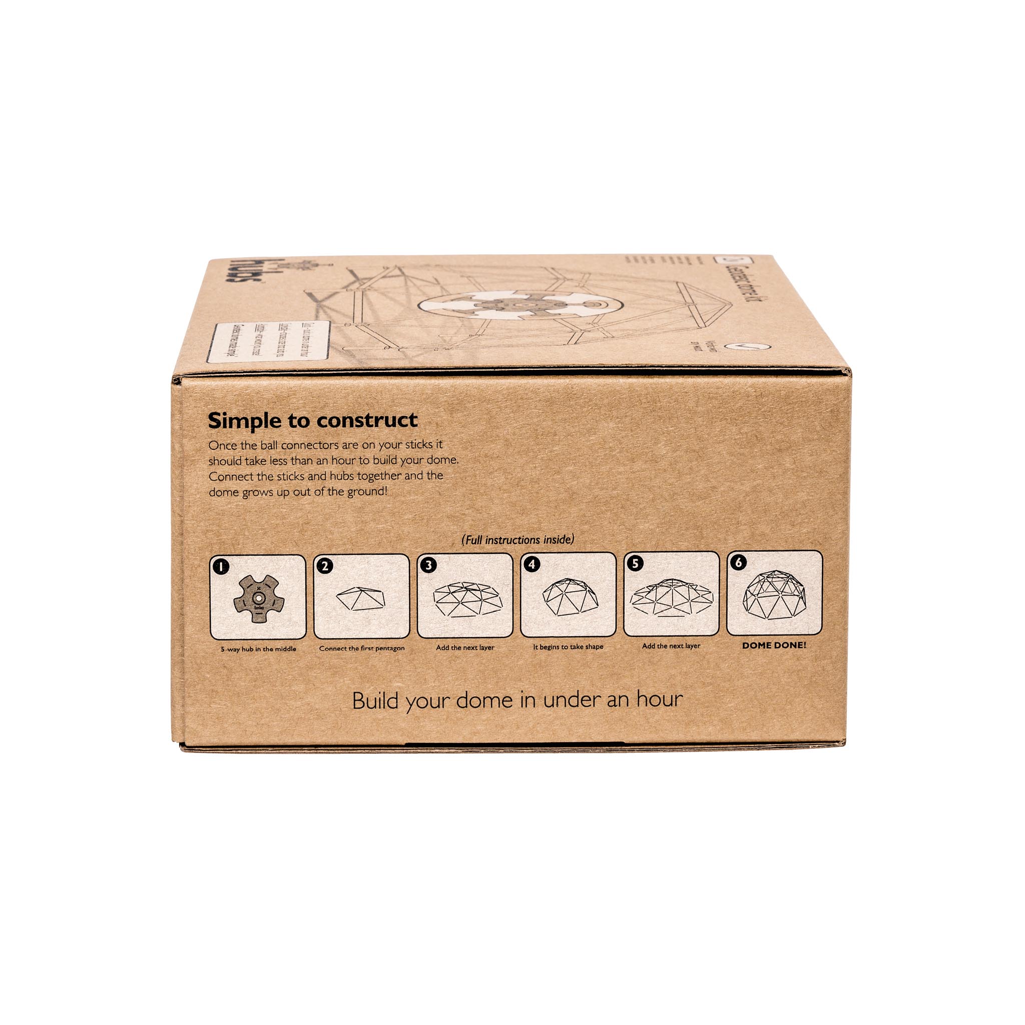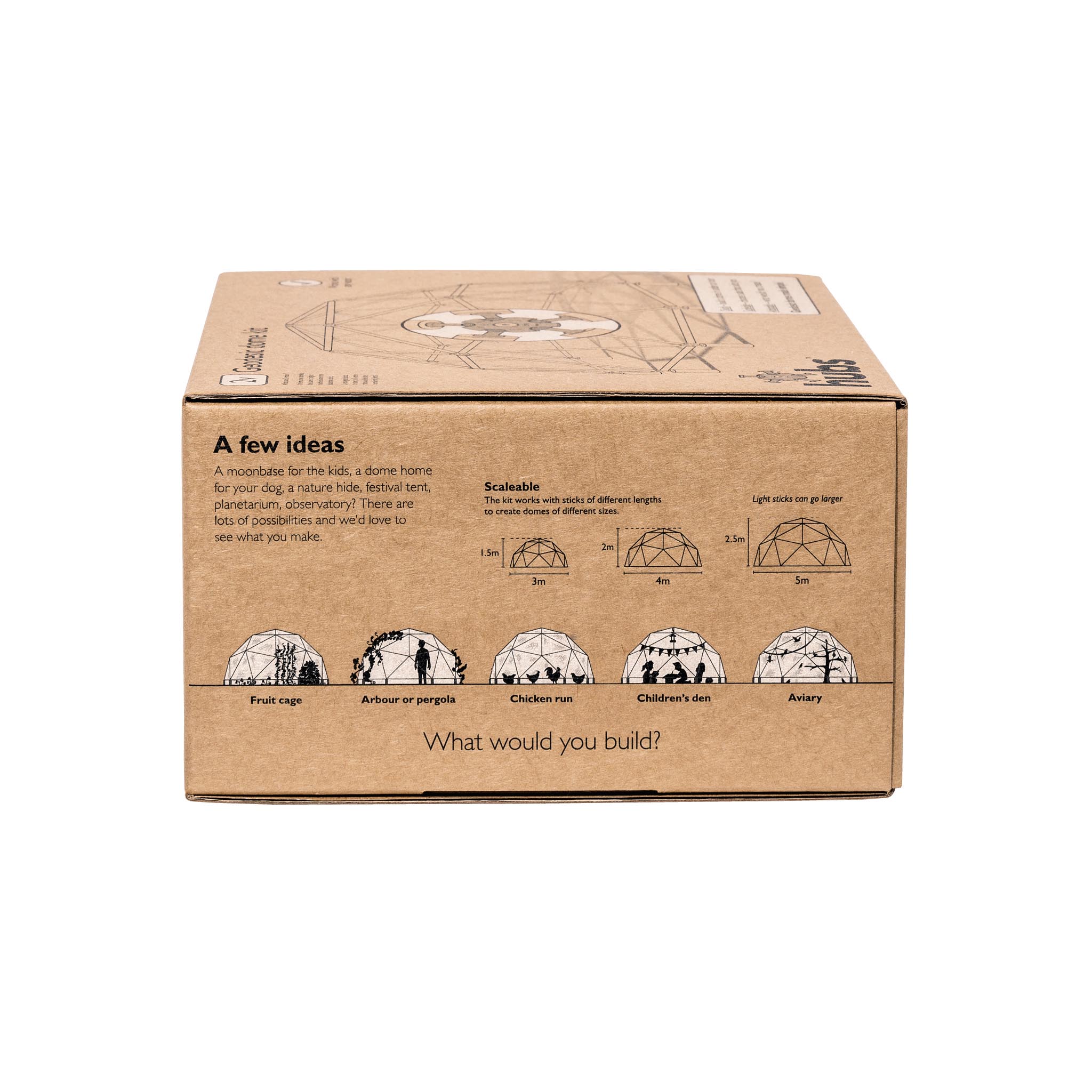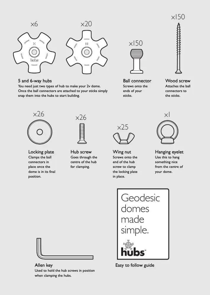| What is in the kit? | 5-way hubs, 6-way hubs, ball connectors, screws, locking plates, wing-nuts, hanging eyelet, allen key, step-by-step guide, waterproof build instructions; all the information they need to get them started. |