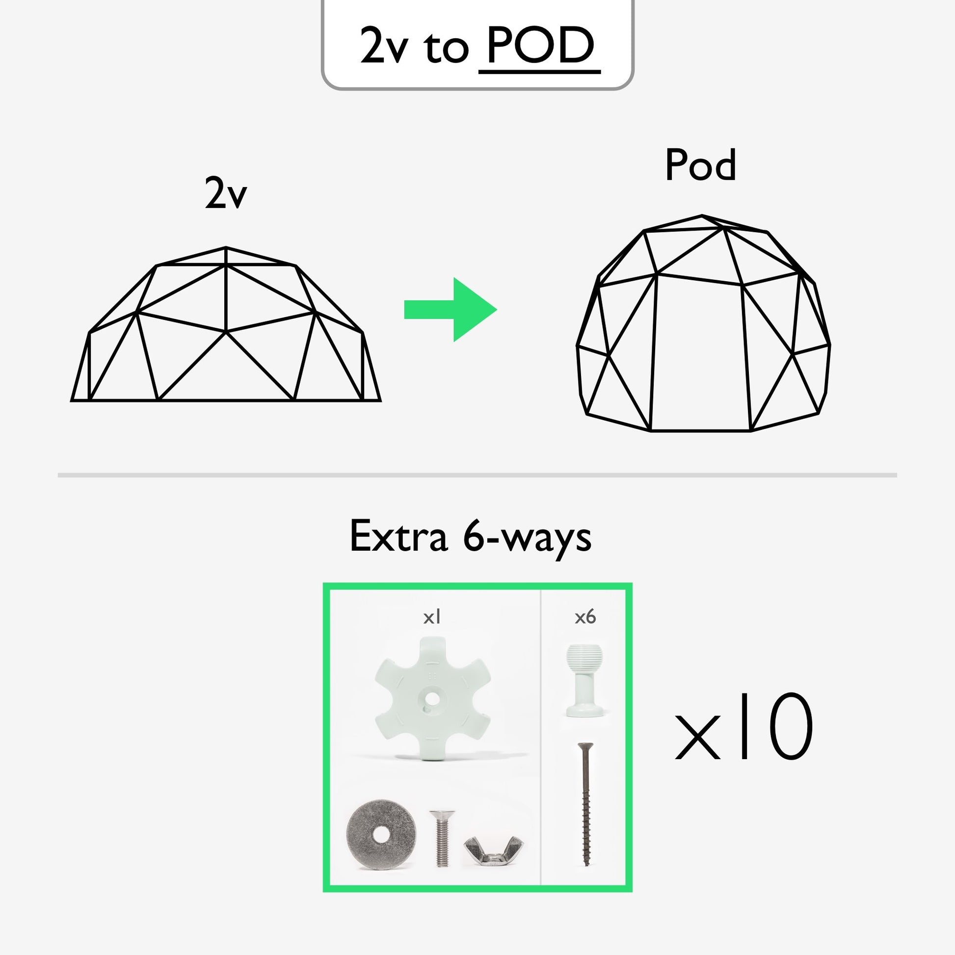 A pack of ten 6-way hubs with associated ball connectors and wood screws and clamping metal work, which will enable you to add another layer to a regular 2v dome to create the 'Pod' structure.